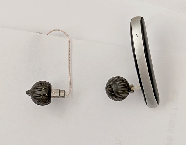 For one thing, these are surprisingly hard to insert & remove. I have an experienced hearing center helping me, but I just can’t get the hang of it. It takes a lot of force to get them in, and removing them is even more difficult, as the “posts” are very hard to grasp and just don’t seem long enough to easily pull them out. Also, the domes I’m using are little round rubber things and they are uncomfortable. It takes me about 10 minutes of painful wrangling daily to get these things in or out