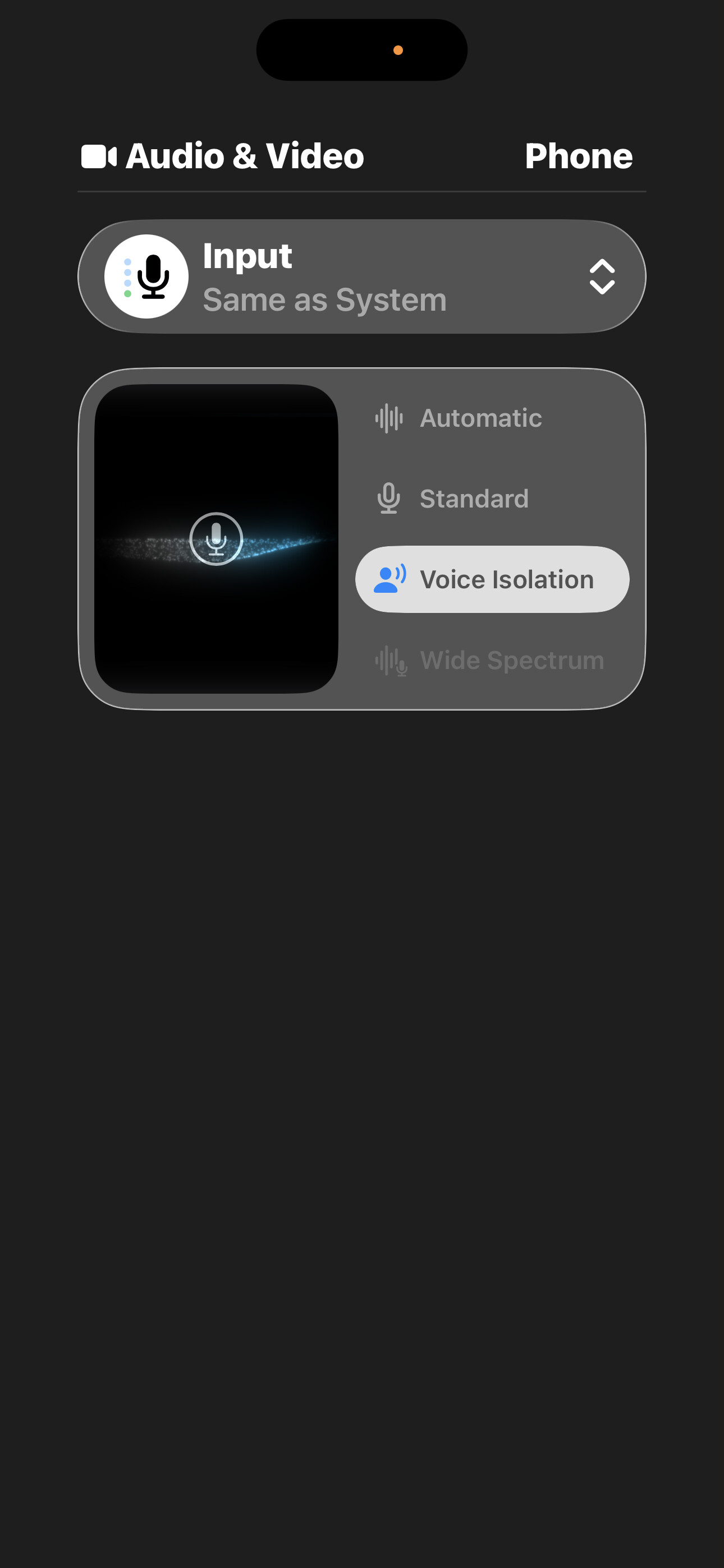 When an app that uses the iPhone microphone is active, a microphone icon will appear in the Dynamic Island (notch area in top center of screen): (see Phone Controls orange area)