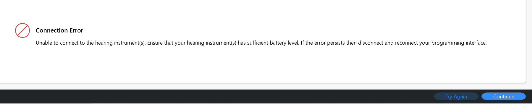 Finally went for it now I keep getting this msg. both ha’s are being assigned but i get this msg when i hit continue. i click connection assistance and its in BTE mode. i clicked wireless which shows my style if hearing aids, i hit back and its in bte mode again. what am i doing wrong? noah link shows up. hearing aids assign to each side and batterys are full ty.